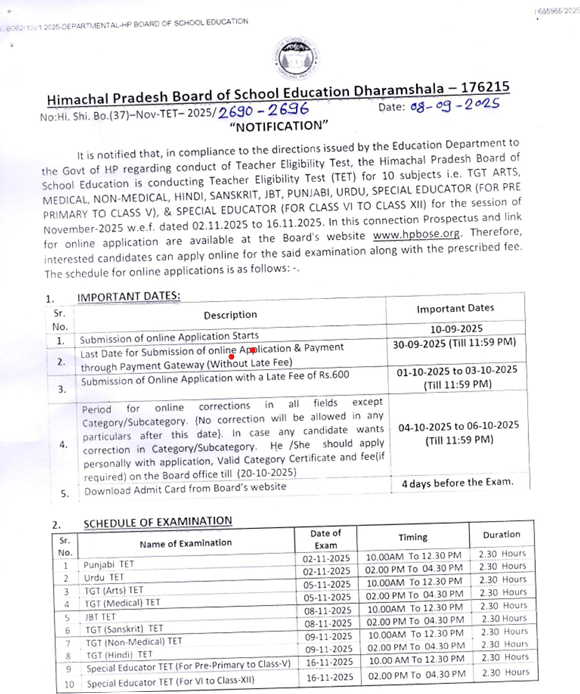 HP TET November 2025: हिमाचल प्रदेश शिक्षक पात्रता परीक्षा का पूरा विवरण अगर आप हिमाचल प्रदेश में सरकारी स्कूल में अध्यापक बनने का सपना देखते हैं, तो आपके लिए HP TET 2025 एक सुनहरा मौका है। हिमाचल प्रदेश स्कूल शिक्षा बोर्ड (HPBOSE), धर्मशाला हर साल दो बार शिक्षक पात्रता परीक्षा (TET) आयोजित करता है। यह परीक्षा न सिर्फ शिक्षण के क्षेत्र में आपके करियर का रास्ता खोलती है बल्कि आपको सर्टिफाइड और क्वालिफाइड टीचर होने का प्रमाण भी देती है। इस बार HP TET नवंबर 2025 सत्र का नोटिफिकेशन जारी हो चुका है। परीक्षा का आयोजन 02 नवंबर से 16 नवंबर 2025 तक किया जाएगा। आवेदन प्रक्रिया 10 सितंबर से शुरू होकर 30 सितंबर तक चलेगी।